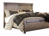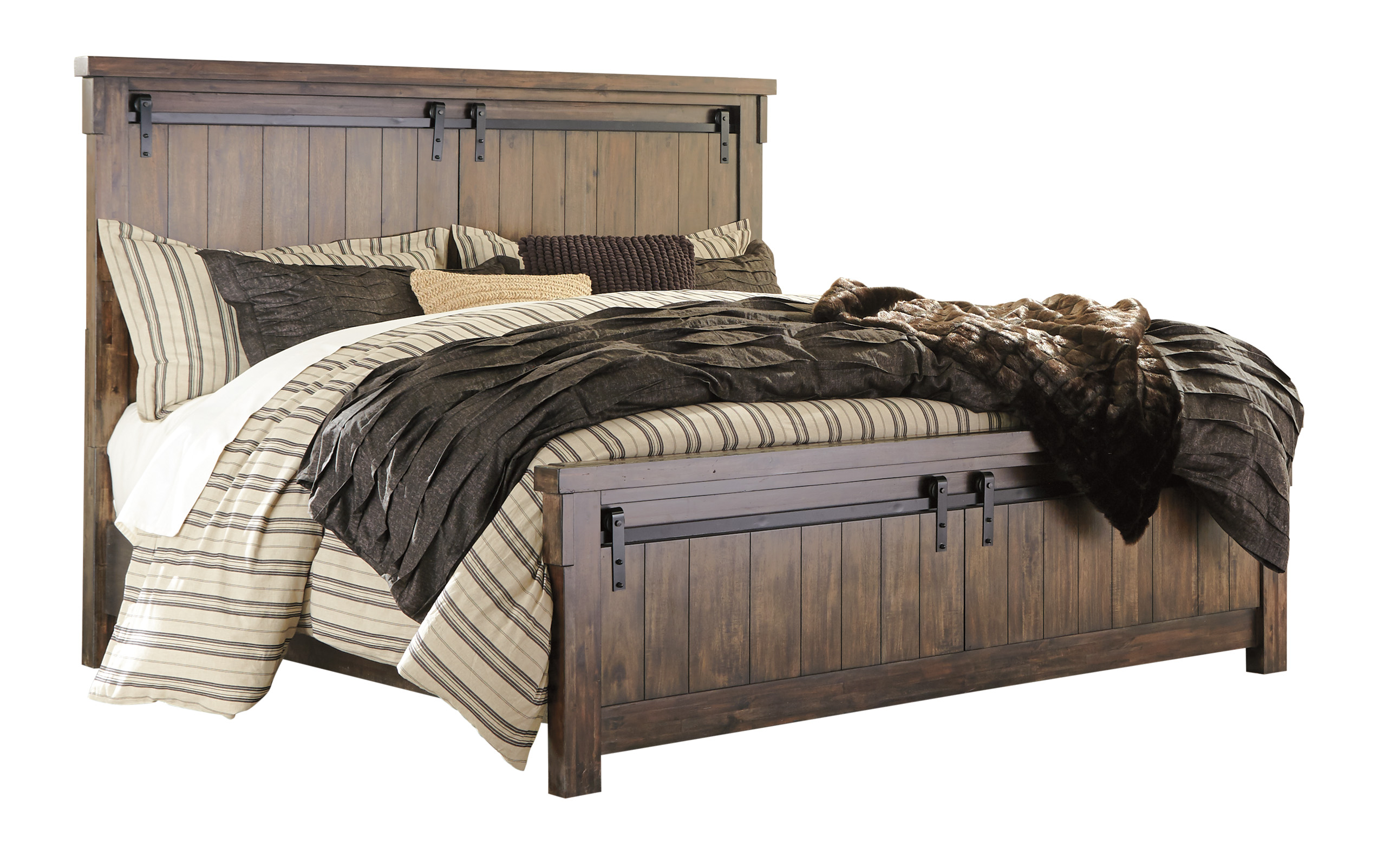 Opposites attract. The Lakeleigh panel bed opens our eyes to how casually rustic styling and an industrial hip vibe make for one happy marriage. Elements that beautify the chunky, linear profile include through-tenon styling, replicated planking and faux barn door pulls loaded with charm.